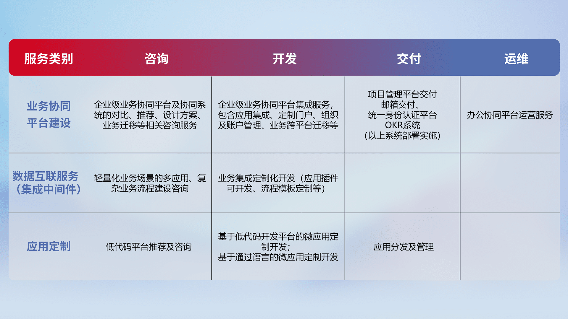针对钉钉、、企微、、IDaas等平台级产品提供产品的规划、、方案、、、交付、、、定制化开发等服务,,,实现如统一协同办公、、、智能客户服务、、、、混合会议管理、、、、智能数据查询、、等业务场景,,,,实现数字化转型。。。。