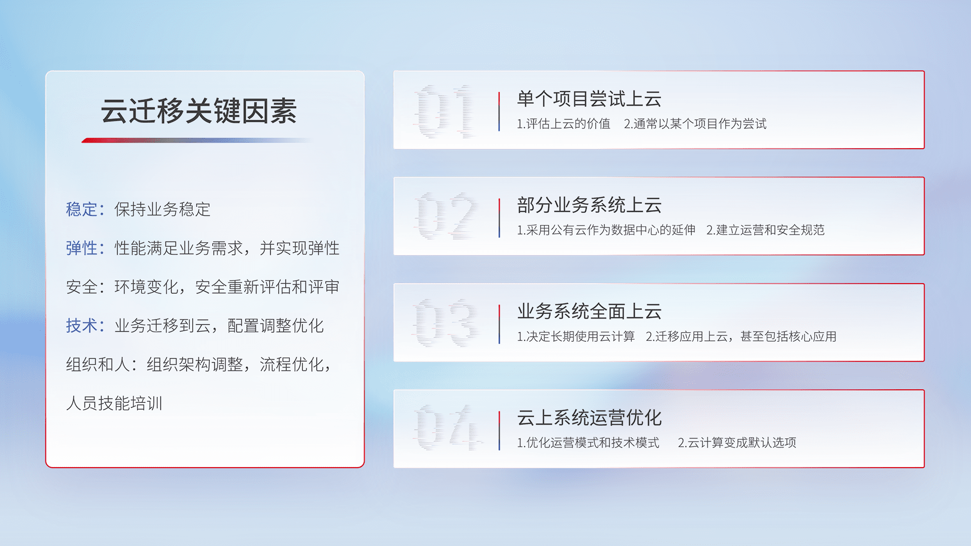 结合实际业务,,,,从规划设计、、、、云平台选型、、、云原生改造、、、数据迁移、、、、集成交付,,迁移全过程为客户识别最佳上云路径,,,,做好风险识别管理,,设计网络架构、、、、身份权限、、、、安全审计合规、、、操作审计、、日志审计、、、监控告警策略、、、多站点容灾设计等,,,对云上基础设施进行整体规划,,,,提升IT治理水平,,,以满足弹性、、、、高可用、、、、高性能的需求。。。