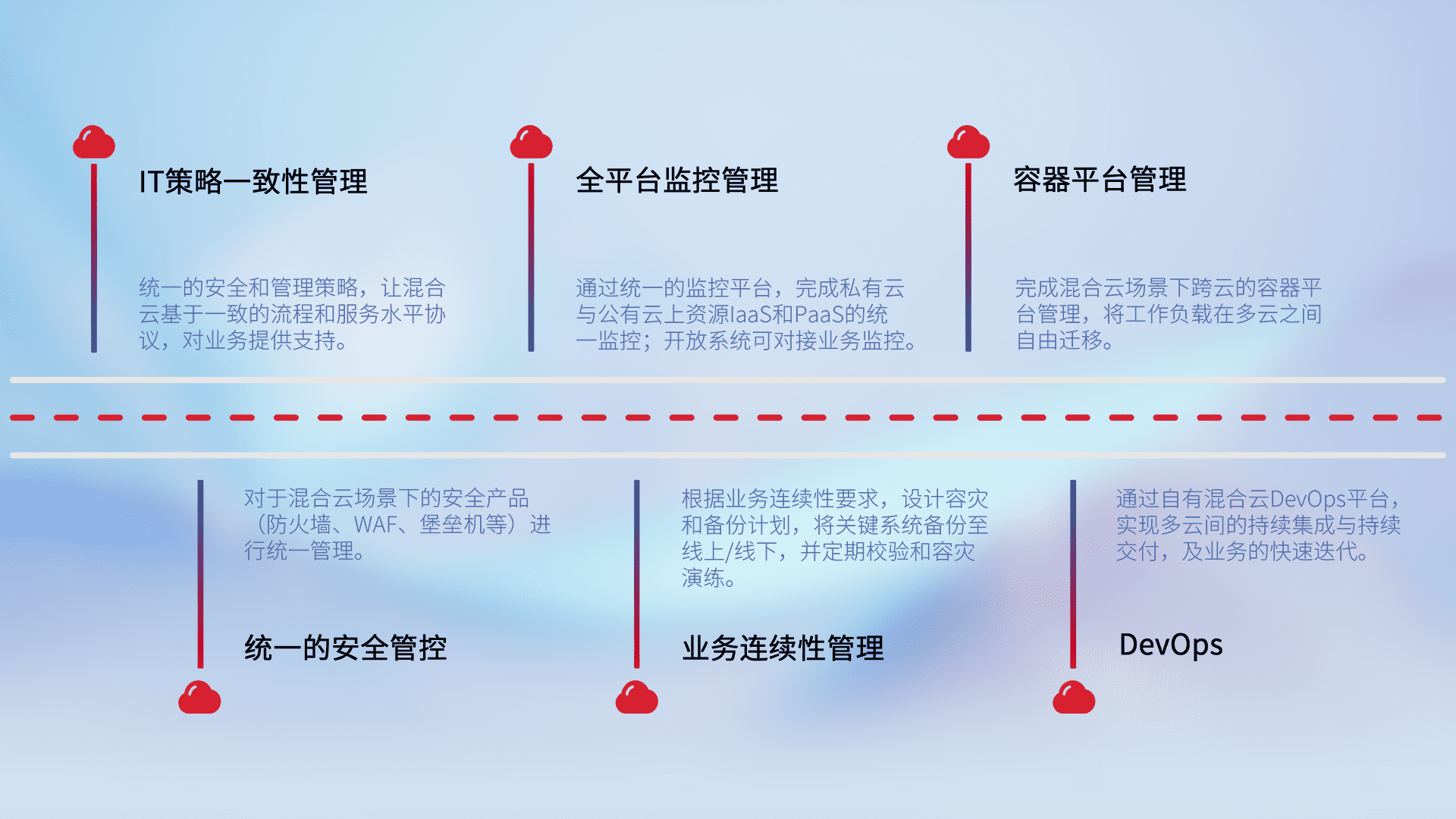 通过多云纳管,,,,以统一的资源数据模型把客户的云资源进行抽象和封装,,,进而实现对多云资源的统一操作,,,,保障云资源管理的可靠性、、稳定性与可用性。。。。量身定制化运维内容,,,配置、、、、开发运维、、、补丁管理、、、、备份、、监控、、、、认证和访问管理、、、、审计和日常巡检等,,保障在用云过程中的可靠度,,稳定度以及高可用率。。。。